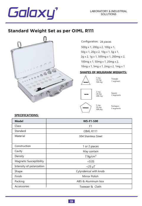 The Standard Weight WS-F1-500 is a high-precision calibration weight designed to ensure the accuracy and reliability of laboratory balances and weighing instruments. Calibration weights play a crucial role in maintaining measurement consistency, and the WS-F1-500 is specifically manufactured to meet the stringent requirements of laboratories, research facilities, educational institutions, and industrial environments. With its precise mass and durable construction, this standard weight is an essential tool for verifying and calibrating weighing equipment.