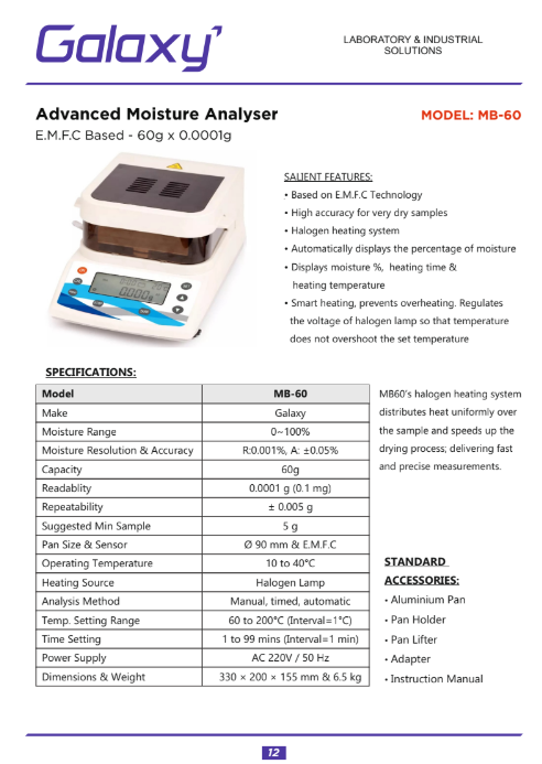 The EMFC Moisture Analyzer MB-60 is a precision testing instrument designed to deliver accurate moisture content measurements with ease, making it an essential tool for laboratories, industrial quality control teams, food processors, and research facilities. Developed with a focus on reliability and user convenience, the MB-60 combines advanced moisture sensing technology with intuitive operation to help professionals quickly assess moisture levels in a wide range of samples including powders, granules, chemicals, food ingredients, and agricultural products. Its balanced design emphasizes both performance and efficiency, enabling consistent results across diverse testing applications.