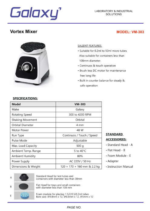 Designed for user convenience, the VM-303 features simple controls, low-noise operation, and maintenance-free performance. The mixer accommodates various tube sizes and adapters, making it versatile for everyday laboratory tasks. Whether preparing samples for analysis, dissolving powders, or blending reagents, this vortex mixer enhances productivity and consistency.