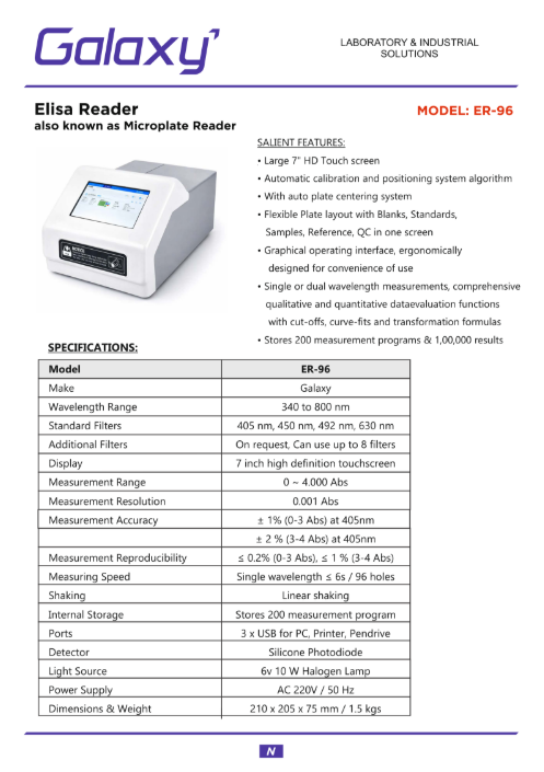 The ELISA Reader ER-96 is a high-precision microplate reader designed for reliable and accurate absorbance measurement in enzyme-linked immunosorbent assay (ELISA) applications. Engineered to support 96-well microplates, this instrument provides consistent optical performance for diagnostic laboratories, research facilities, and pharmaceutical quality control.