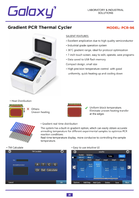 Featuring a robust thermal block and uniform heating and cooling performance, the Gradient Thermal Cycler ensures consistent results for a wide range of applications including genetic research, cloning, mutation analysis, clinical diagnostics, and forensic studies. Its intuitive touchscreen interface and programmable protocol settings make it simple to design, save, and run complex thermal profiles with ease.