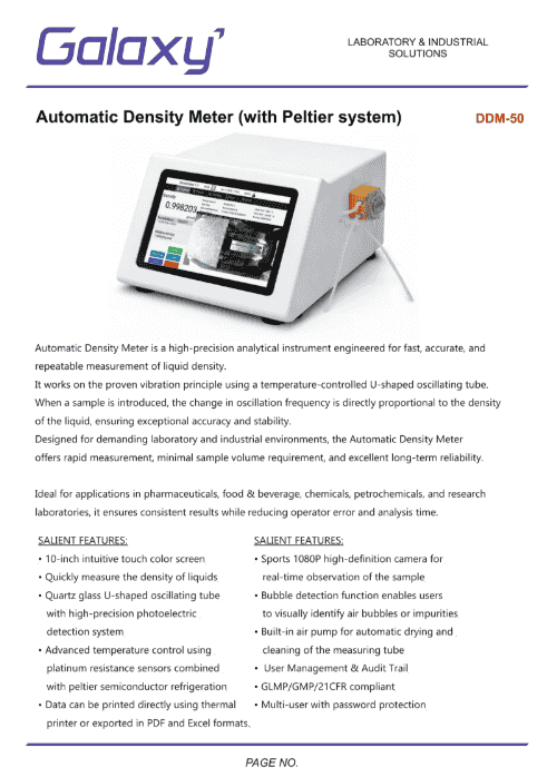 The Automatic Density Meter is a high-accuracy analytical instrument designed to measure the density, specific gravity, and concentration of liquids with speed and consistency. Built for modern laboratories and industrial quality control environments, this advanced device delivers reliable results while minimizing operator involvement, making it ideal for pharmaceuticals, chemicals, petrochemicals, food & beverage, and research applications.
