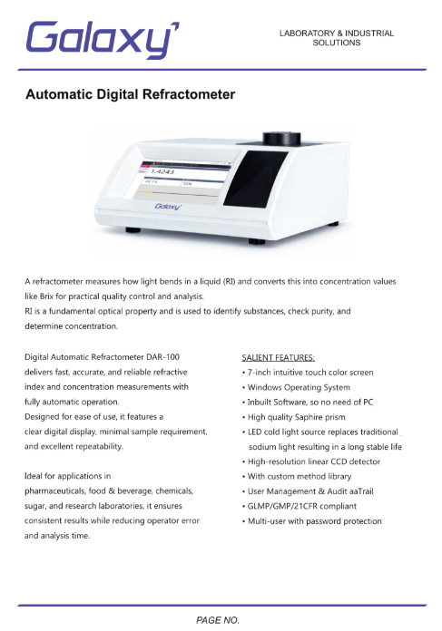 An Automatic Digital Refractometer is a precision laboratory instrument designed to measure refractive index and concentration parameters such as Brix with exceptional accuracy and repeatability. It is widely used in quality control, research, and production environments where reliable liquid analysis is essential.