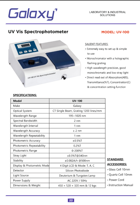 The UV Vis Spectrophotometer UV-100 is a high-performance analytical instrument engineered to deliver precise and reliable measurement of light absorbance and transmittance across both the ultraviolet (UV) and visible (Vis) regions of the electromagnetic spectrum. Designed to meet the needs of modern laboratories in education, research, environmental testing, pharmaceuticals, biotechnology, and industrial quality control, the UV-100 combines accuracy, simplicity, and versatility in a compact and user-friendly package.