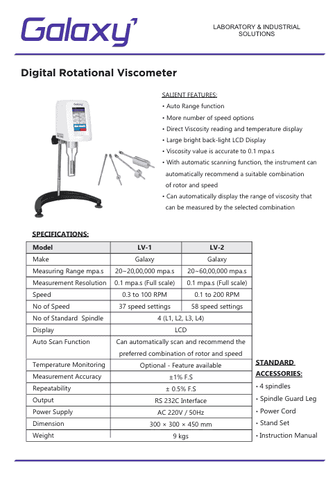 The Rotational Viscometer LV-2 is a precision laboratory instrument designed for reliable viscosity measurement of low to medium viscosity liquids. Built for consistency, ease of use, and dependable performance, this viscometer is widely used in quality control, research laboratories, production environments, and educational institutions.