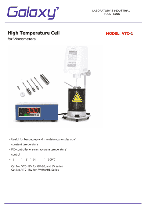 The High Temperature Cell VTC-1 is a specialized accessory designed for rotational viscometers to perform viscosity measurements at elevated temperatures. In many industrial and laboratory applications, liquids must be tested under high-temperature conditions to understand their behavior during processing or actual use. The VTC-1 provides a controlled environment that allows accurate viscosity measurement of materials when exposed to higher temperatures, making it an essential tool for advanced viscosity analysis.
