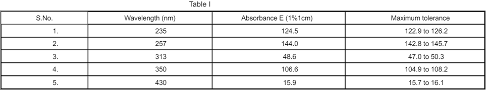 9. Now take these readings and write them down.Note the absorption maxima of Potassium Dichromate solution at a different wavelength and calculate the ‘Specific Absorbance’formula and tolerance is given in below table.