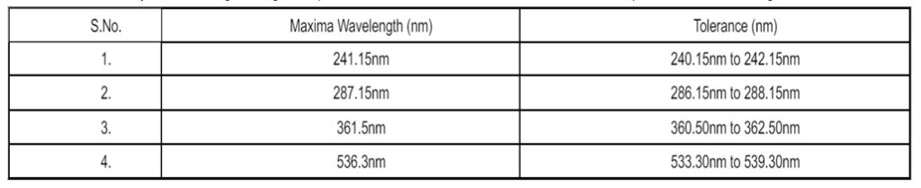 5. Scan it and verify the wavelength using absorption maxima of Holmium Perchlorate solution. The permitted tolerance is given in the table below: